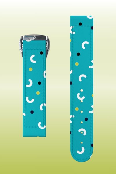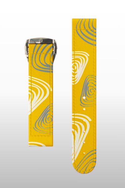 Il cinturino Spin è caratterizzato da una grafica fluida con cerchi di colore bianco e azzurro su tessuto in cotone giallo intenso. Si abbina perfettamente con il quadrante bianco o quello nero del nostro O-2-O oppure con il Romeo.
