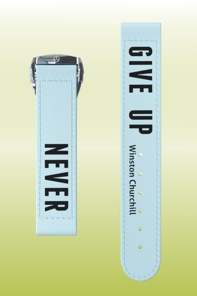 Ispirato all’iconico motto, su questo cinturino in cotone azzurro acqua spicca la scritta nera “Never Give Up”.