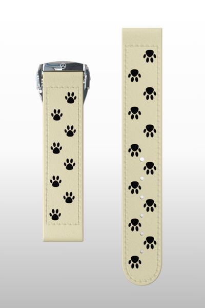 Orme di cucciolo stampate su tessuto in cotone color beige chiaro. Il colore neutro del tessuto permette di abbinare questo cinturino con abbigliamento di qualsiasi colore: sceglietelo con il nostro O-2-O con quadrante nero.