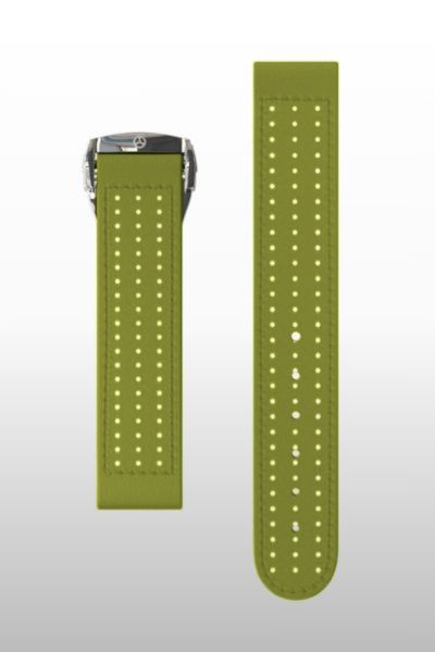 Il cinturino Street ha una grafica che richiama l’impronta della ruota di bicicletta sull’asfalto urbano. Il tessuto è in cotone colore grigio tarmak, con impronte bianche ed arancioni.