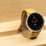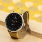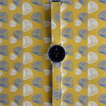 The Spin band features a fluid graphic with white and light blue circles on a deep yellow cotton fabric.