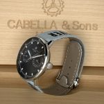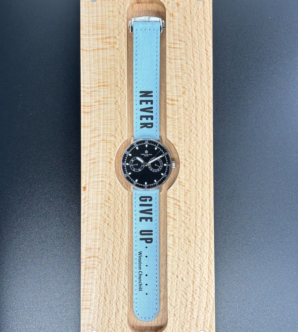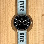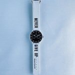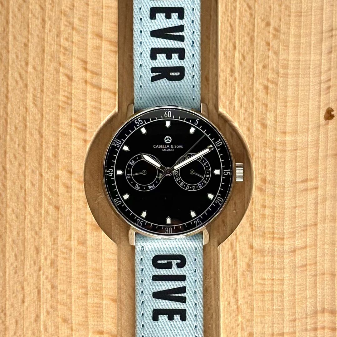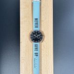 Inspired by the iconic motto, this aqua blue cotton strap features the black writing “Never Give Up.”